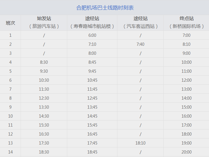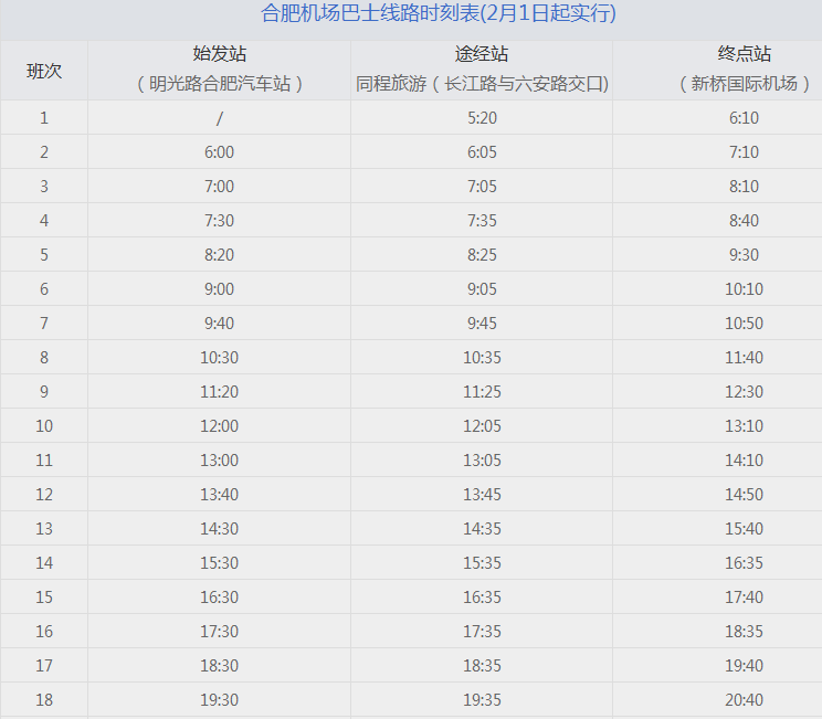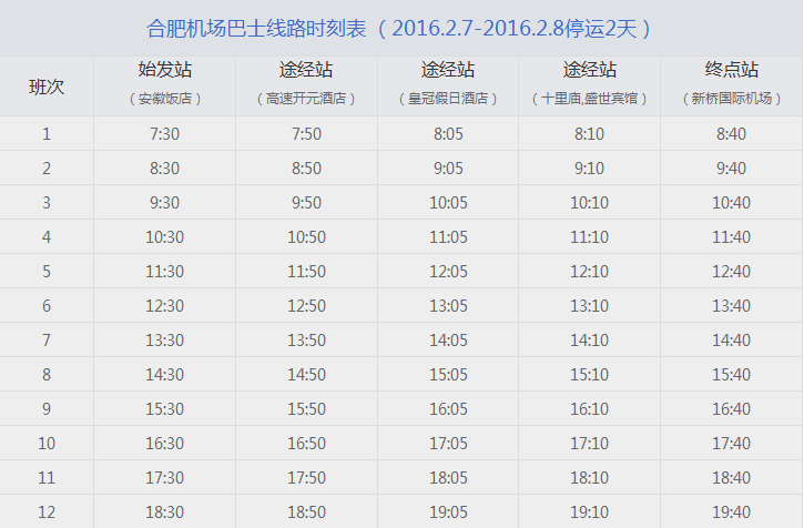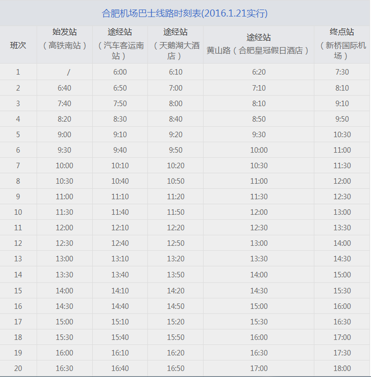 注: 中途站点(天鹅湖大酒店)、黄山路(皇冠假日酒店终点站)和终点站(新桥国际机场)时刻表为预计时刻,可能会有时间上的误差,请提前10-15分钟到始发站和中途站点购票乘车。
