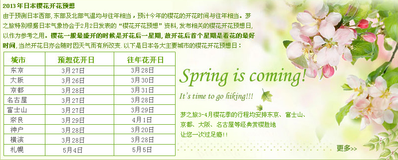 樱花是日本的国花,这个国家遍植樱花。每年春天,日本全国的樱花由南至北连成一线次第开放,从四国一直开到北海道。粉红色的花朵堆云聚雾,绵延不断,景象十分壮观,日本人称之为“樱花前线”。每到这种季节的时候,日本人就会全家出动、扶老携幼到各个植有大片樱花树的地方去赏樱,品评樱花的开放姿态。有好花者,樱花开到哪,他就跟到哪。